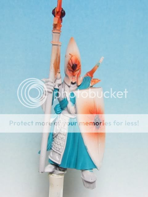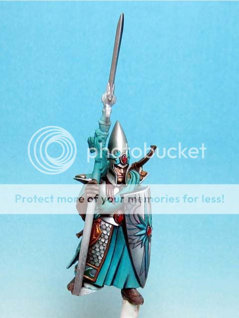 I also tried some kind of red light effect on the cross of the bionic eye but that did not convince me. I also worked the metals in the top of the banner with glazes of red, Scab Red (GW) and the like, to give a bit of intensity to the figure.
